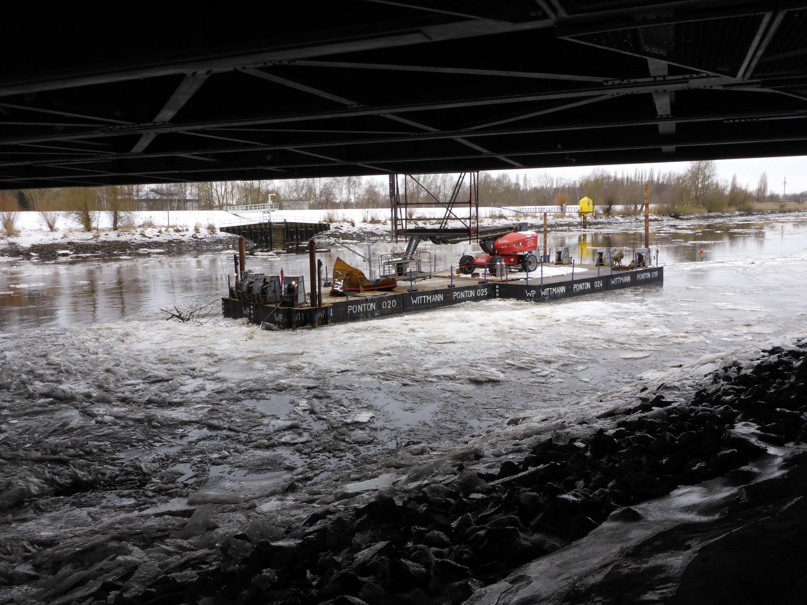 Starker Eisgang auf der Lesum umspült den Bauponton