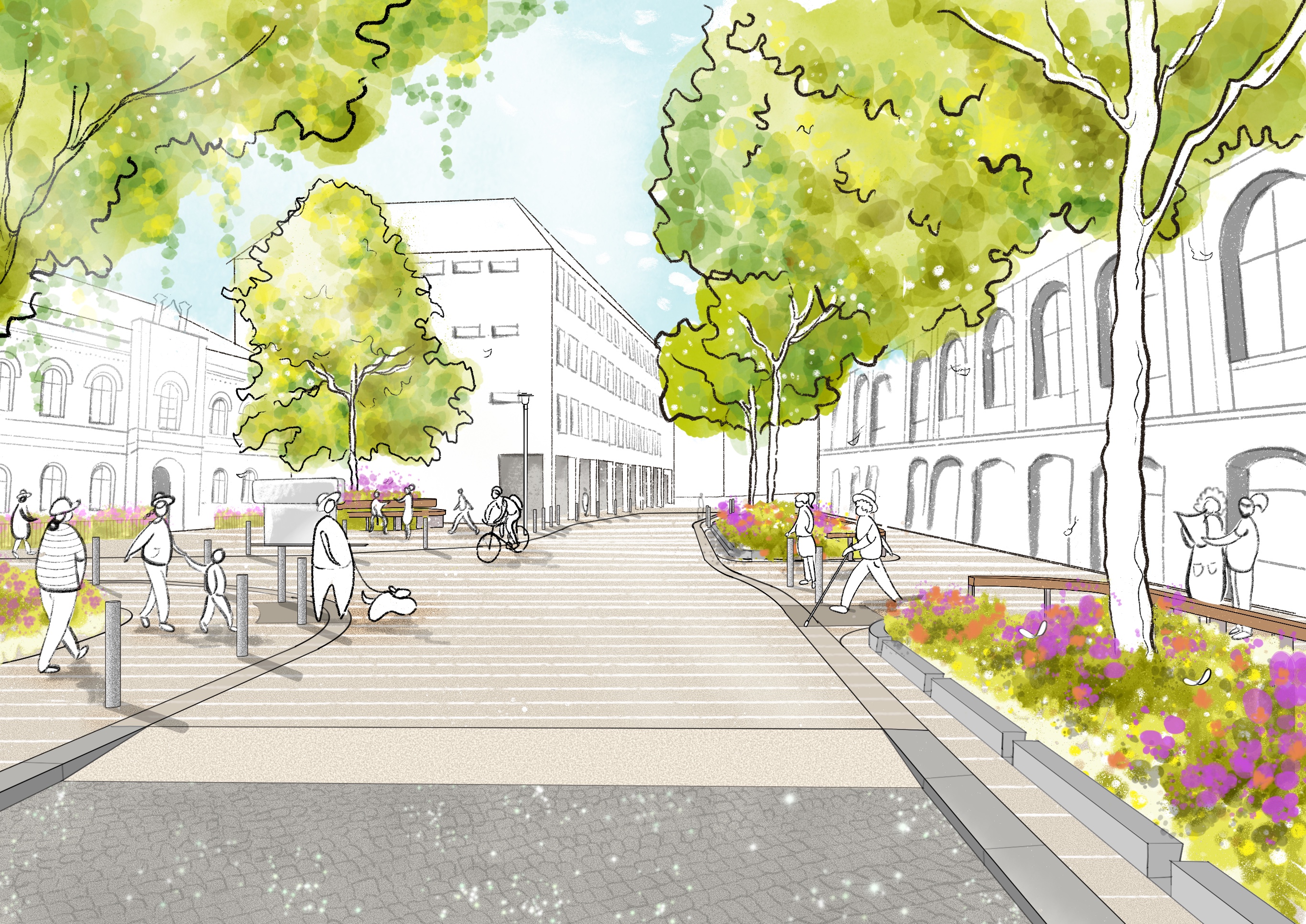 Die Dechanatstraße erhält mehr Aufenthaltsaqualität und ist künftig besser auf Starkregenereignisse eingestellt.